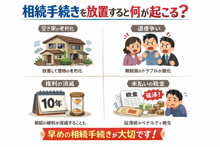 相続手続きを放置すると、不動産の名義変更ができず、売却や活用が進まないなどの支障が生じます。また、相続人や財産の把握が難しくなり、時間が経つほど手続きが複雑化する傾向があります。その結果、相続人同士の意見対立や、未整理のまま残った債務に関する請求トラブルが発生することもあります。早めに相続全体を整理し、適切な対応を取ることが、将来の大きな問題を防ぐために重要です。